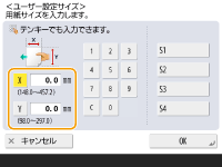 2 | <X>辺と<Y>辺の長さを設定する ![]() <X>または<Y>を押し、テンキーでそれぞれの辺の長さを入力します。 ![]() よく使う用紙サイズを<S1>~<S4>ボタンに登録しておけば、ワンタッチで呼び出すことができます。定形外サイズの用紙を登録する(ユーザー設定用紙) |