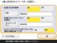 ![]() この設定は、<アクセスポイントモード設定>の<個人別SSID/ネットワークキーを使用>が<ON>に設定されているときに使用できます。<アクセスポイントモード設定> 個人別SSID/ネットワークキーを設定しているときに接続できるモバイル機器は1台のみです。 |