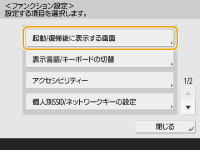 本機の起動後に表示される画面を設定する本機の起動時にログイン操作をする設定になっている場合(ログイン画面の表示方法を指定する)は、個人設定で設定できる項目に<起動/復帰後に表示する画面>が表示されます。起動後に表示する画面をユーザーごとに設定することができます。 ![]() |