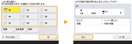 コピー/スキャンして送信では、登録した設定を呼び出すときに、確認画面を表示させないようにすることもできます。