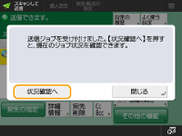 指定した宛先の総数を確認するには画面上部に、指定した宛先の総数が表示されます。送信前に宛先の数に誤りがないか確認することができます。 発信元の情報を付けて送信するには送信元の名前やIファクスアドレスなどを付けて送信することができます。 <発信元記録>送信状況を確認するには<状況確認>画面で送信状況を確認できます。状況を確認したうえで、もう一度送信しなおしたり、送信を中止したりすることができます。 送受信状況や履歴を確認する<ジョブ受付時の確認表示>が<ON>に設定されている場合は、送信ジョブが受け付けられたあとに表示される以下の画面から、<状況確認>画面を表示させることができます。 <ジョブ受付時の確認表示>送信結果のレポートをプリントするにはスキャンの基本画面で<その他の機能>  <送信結果レポート>を押すと、送信結果が記載されたレポートが自動的にプリントされるように設定できます。 <その他の機能>からジョブごとに設定するためには、 <送信結果レポート>で<エラー時のみ>または<OFF>を選択し、<「その他の機能」 でのプリントを許可>を<ON>にする必要があります。 安全にファイルを送信するには送信画像の写真が黒くつぶれてしまうときや、カラー原稿の下地の薄い色を除去できないときは以下の条件/設定を満たす場合は、送信画像の品位を改善できることがあります。 ジョブ種別: ファクス(メモリー送信)またはスキャンして送信(ファクス/Iファクス) <カラー選択>: <白黒2値>(スキャンして送信時) <原稿の種類>: <文字> <濃度> <背景調整>: <自動> <解像度>: 200 dpi x 400 dpi 、300 dpi x 300 dpi*、400 dpi x 400 dpi 、600 dpi x 600 dpi* *はスキャンして送信で設定可能 |