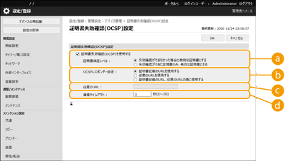 通信中の相手から受信した証明書が有効かどうかを検証するには、本体に登録した「証明書失効リスト(CRL)」と照合する方法と、OCSP(Online Certificate Status Protocol)レスポンダー(OCSPに対応したサーバー)に問い合わせる方法があります。お使いの環境に合わせて証明書の失効確認方法を設定してください。これらの登録は管理者が行ってください。