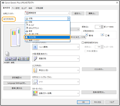 予約プリント機能を使用するには、あらかじめ<強制留め置き>を<OFF>にしておく必要があります。<強制留め置き> 予約プリント機能を使用するには、あらかじめ<ACCESS MANAGEMENT SYSTEMを使用>を<OFF>にしておく必要があります。 予約プリントとして投入されたプリントジョブは、<ACCESS MANAGEMENT SYSTEMを使用>を<ON>にすると削除されます。 |