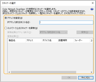 [Color Network ScanGear 2 Tool]をクリックする1 | [アドレスを指定]をクリックし、本機のIPアドレスまたはホスト名を[IPアドレスまたはホスト名]テキストボックスに入力する |