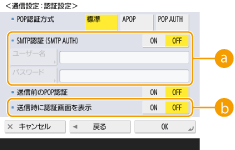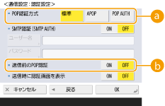 1 | 必要な設定をする ![]() <POP認証方式>POP3サーバーの認証方式を設定します。認証時にパスワードを暗号化するときは<APOP>、メール受信(POP)によってユーザー認証を行うときは<POP AUTH>を選びます。 <送信前のPOP認証>POP3サーバーを使って認証をするときは<ON>を押します。 |