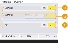 5 | 暗号化通信の設定をする ![]() <SMTP送信>SMTPサーバーとの通信をTLSで暗号化するときは<ON>を押します。<ON>に設定したときは、サーバーとの通信時にTLSサーバー証明書を確認したり、CNを検証項目に追加したりすることもできます。<Eメール/I ファクス設定> <SMTP送信時の証明書確認> <SMTP受信>SMTPサーバー機能を使ってEメールやIファクスを受信するときに、通信をTLSで暗号化する場合は<常にTLS>または<ON>を押します。暗号化されたデータ以外は受信したくないときは<常にTLS>を選択してください。 SMTP受信をTLSで暗号化したい場合は、あらかじめ使用する鍵ペアを用意しておいてください。TLS用の鍵と証明書を設定する <POP>POP3サーバーとの通信をTLSで暗号化するときは<ON>を押します。<ON>に設定したときは、サーバーとの通信時にTLSサーバー証明書を確認したり、CNを検証項目に追加したりすることもできます。<Eメール/I ファクス設定> <POP受信時の証明書確認> |