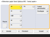 Si <Toujours spécifier> sous<Régl. par défaut plateau multifonctions> est réglé sur <Papier favori>, un écran s'affiche pour vous permettre de sélectionner votre « Papier favori » lorsque vous chargez le papier dans le plateau multifonctions. <Régl. par défaut plateau multifonctions> |