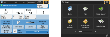 Appuyez sur la touche affichée dans l’écran <Accueil> et dans l'écran des fonctions de base pour personnaliser l'écran, par exemple en réorganisant les touches ou en créant une touche de raccourci. Personnalisation de l'afficheur tactile![]() Vous pouvez modifier les paramètres d'affichage, notamment en définissant l'écran qui doit apparaître lorsque l'appareil est mis sous tension ou en indiquant si le message de niveau de papier ou de toner doit apparaître. <Réglages d'affichage> Vous pouvez définir l'écran qui doit s'afficher au-delà d'un certain délai d'inactivité. <Fonction après réinit. auto> |