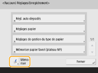 Si <Raccourci Réglages/Enreg.> ne s'affiche pas sur l'écran <Accueil>, appuyez sur  <Réglages de gestion d'accueil>  <Restreindre l'affichage des fonctions>  <Régler>  définissez <Raccourci Réglages/Enreg.> pour l'afficher. Raccourcis enregistrables : 10 |