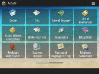 L'ordre, la taille et le nombre de boutons affichés sur l'écran <Accueil> peuvent être modifiés, de même que l'image d'arrière-plan. <Réglages de gestion d'accueil> vous permet de configure les réglages d'affichage de la ligne de temps et d'afficher/de masquer les touches de fonction.