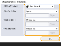Vous ne pouvez pas changer la <Méthode de réception> après avoir enregistré les <Réglages de transfert>. Pour utiliser les réglages de transfert après avoir changé la <Méthode de réception>, vous devez les réenregistrer.