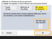Pour utiliser un nom d'utilisateur et mot de passe séparés pour le dossier personnel , appuyez sur <Util. infos auth. pour chq utilis.> pour ajouter une case. Retirez la case pour utiliser le même nom d'utilisateur et le même mot de passe que ceux saisis lors de la connexion. Si une case est ajoutée à cet élément, un nom d'utilisateur et un mot de passe doivent être enregistrés pour chaque utilisateur.