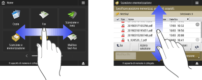 Visualizzare la guida delle funzioniPremere <Istruzioni assistite> per visualizzare una schermata che mostra come utilizzare le funzioni della macchina nonché i suggerimenti per la copia, scansione, ecc. Visualizzare questa schermata per maggiori informazioni sulle funzioni disponibili e sul relativo utilizzo. ![]() Esempio: istruzioni assistite per le funzioni Copia Quando si seleziona una voce dall'elenco, appare la schermata delle istruzioni assistite. ![]() Utilizzare la funzione "?"In base alla funzione visualizzata, nella parte superiore destra della schermata può apparire . Premere per leggere la descrizione e il metodo di funzionamento della funzione.![]() Premere <Fine> per tornare alla schermata precedente. Utilizzare come se si trattasse di uno smartphone (scorrere/selezionare e trascinare)In alcune schermate, è possibile cambiare pagina o scorrere sullo schermo con il dito verso l'alto/il basso o verso sinistra/destra come se si trattasse di uno smartphone. ![]() ![]() È possibile anche disabilitare le funzioni di scorrimento. <Utilizzo funzione scorrimento con gesto rapido> Le operazioni di scorrimento e trascinamento della selezione non possono essere utilizzate quando <Inversione colori schermo> è impostato su <On>. <Inversione colori schermo> Nelle schermate che consentono lo spostamento dei pulsanti, i pulsanti possono essere spostati mediante trascinamento. ![]() |