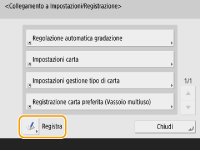 Se <Collegamento a Impostaz./Reg.> non è visualizzato nella schermata <Home>, premere   <Impostazioni gestione Home> <Limite visualizzazione funzioni>   <Imposta> per impostare <Collegamento a Impostaz./Reg.> da visualizzare.