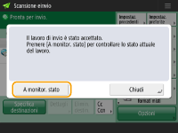 Per verificare il numero totale di destinazioni specificateIl numero totale di destinazioni specificate viene visualizzato in alto a destra della schermata. Ciò consente di verificare che il numero di destinazioni sia corretto prima dell'invio. Per annullare immediatamente un lavoro in corso di invioSe si preme  (Stop) sul pannello di controllo durante l'invio di un lavoro, viene visualizzato il messaggio <Si vuole annullare il seguente lavoro di invio?>. Premere <Sì> per annullare l’invio. Premere  (Stop) in presenza di più lavori di invio per visualizzare la schermata di selezione del lavoro di invio da annullare. Se il lavoro di invio da annullare non è visualizzato, premere <Controllo altri lavori> per visualizzare <Lavori invio>. Selezionare il lavoro da annullare e premere <Annulla>. Per controllare gli stati dei documenti inviati e salvatiNella schermata <Monitor. stato>, è possibile verificare gli stati dei documenti inviati/salvati. Questa schermata consente di inviare/salvare nuovamente i documenti oppure di annullare l'invio/salvataggio dopo la verifica degli stati. Controllo di stato e registro per i documenti acquisitiSe <Visualizzazione notifica ad accettazione lavoro> è impostato su <On>, la schermata <Monitor. stato> potrebbe essere visualizzata dalla seguente schermata, visualizzata dopo la ricezione di un lavoro inviato. <Visualizzazione notifica ad accettazione lavoro>Per stampare il rapporto dei risultati di invio/salvataggioNella schermata delle funzioni di base per la scansione, se si preme <Opzioni>  <Rapporto risultato TX> è possibile impostare la stampa automatica del rapporto che elenca i risultati dell'invio/salvataggio. Per impostare per ogni lavoro da <Opzioni>, è necessario selezionare <Solo se errore> o <Off> in <Rapporto risultato TX>, quindi impostare <Consentire stampa da Opzioni> su <On>. Nome fileQuando si invia/salva un file, il nome file viene automaticamente impostato in base al seguente formato. È possibile cambiare l'impostazione in modo da poter assegnare un altro nome. Impostazione di un nome di fileQuando si invia per e-mail il formato "Numeri lavoro (quattro cifre)_numeri pagina (tre cifre).nome estensione file", ad esempio "1042_001.jpg" Quando si salva in un file server il formato "Anno, mese, giorno, ora, minuti e secondi di salvataggio del file (14 cifre).nome estensione file", ad esempio "20151030133541.jpg" Oggetto e-mail |