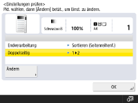 Um die Dokumentausrichtung anzugeben und die Druckausrichtung zu ändern, drücken Sie <Details einstellen>. Wählen Sie <Buchtyp>, wenn die Vorder- und die Rückseite des Dokuments dieselbe Oben-Unten-Ausrichtung haben. Wählen Sie <Kalendertyp>, wenn die Vorder- und die Rückseite des Dokuments unterschiedliche Oben-Unten-Ausrichtungen haben. Außerdem können Sie die Seitenausrichtung des Ausdrucks mit <Buchtyp> oder <Kalendertyp> festlegen.