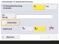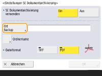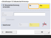 Sie können nicht direkt versenden, wenn <Einstellungen SE Dokumentarchivierung> auf <Ein> gesetzt ist. Diese Einstellung wechselt in den folgenden Fällen zu <Aus>. Geben Sie dann je nach Bedarf das Ziel erneut an oder setzen Sie die Einstellung wieder auf <Ein>. Wenn das Backup-Ziel aus dem Adressbuch gelöscht wurde Wenn ein Adressbuch aus Remote UI importiert wurde Importieren/Exportieren von Einstellungsdaten Wenn ein Adressbuch von der Adressbuch-Verwaltungssoftware empfangen wurde. <Import/Export von Adressbuchverwaltungssoftware> |