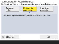 Registrieren eines persönlichen Ordners und Authentifizierungsinformationen für den jeweiligen BenutzerWenn <Definitionsmethode Persönlicher Ordner> auf <Für jeden Anwender speichern> gesetzt ist, registrieren Sie für jeden Benutzer einen der folgenden Ordner als persönlichen Ordner. Die registrierten Einstellungen sind die gleichen, und es wird der gleiche persönliche Ordner registriert, und zwar unabhängig davon, wo die Einstellung konfiguriert wird. <Scannen und Senden> <Infos für jeden Anwender speichern/bearbeiten> <Persönlicher Ordner><Scannen und Speichern> <Netzwerk> <Infos für jeden Anwender speichern/bearbeiten> <Persönlicher Ordner><Zugang zu gespeicherten Dateien> <Netzwerk> <Infos für jeden Anwender speichern/bearbeiten> <Persönlicher Ordner> |