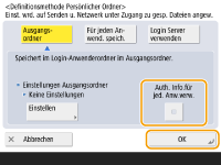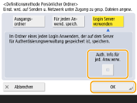 3 | Wählen Sie die zu verwendende Authentifizierungsinformation aus, und drücken Sie <OK>. Um einen separaten Benutzernamen und ein Passwort für den persönlichen Ordner zu verwenden, drücken Sie <Auth. Info.für jed. Anw.verw.>, um ein Kontrollhäkchen hinzuzufügen. Entfernen Sie das Kontrollhäkchen, um denselben Benutzernamen und das bei der Anmeldung eingegebene Passwort zu verwenden. Wenn Sie dieser Option ein Kontrollhäkchen hinzufügen, müssen Sie einen Benutzernamen und ein Passwort für den jeweiligen Benutzer registrieren. ![]() Es wird ein Ordner mit den folgenden Namen im Stammordner erstellt. Wenn <Auth. Info.für jed. Anw.verw.> mit einem Häkchen versehen wird: der vom Benutzer angegebene Benutzername Wenn <Auth. Info.für jed. Anw.verw.> nicht mit einem Häkchen versehen wird: der zum Anmelden verwendete Benutzername |