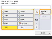 Los destinos registrados en botones de acceso rápido pueden combinarse en un grupo y registrarse como destino único. Para obtener más información, consulte Registrar un grupo en un botón de acceso directo. Para cambiar o eliminar la información de los destinos registrados en botones de acceso rápido, consulte Editar los destinos registrados en botones de acceso directo. Los destinos almacenados en botones de acceso rápido también aparecen en la libreta de direcciones local. |