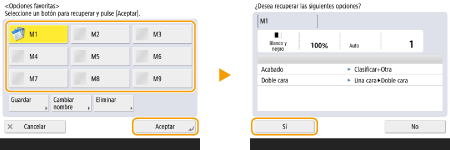 <La información especificada para el nuevo destino de archivopuede incluir una contraseña. ¿Desea incluir la contraseña al guardar? (Pulse [No] para guardar el destino sin la contraseña.)> Si los mensajes anteriores se muestran al registrar <Opciones favoritas> para <Leer y enviar>, realice las siguientes operaciones. Si desea recuperar los ajustes favoritos sin introducir una contraseña, pulse <Sí> para conservar la información de la contraseña. Si desea recuperar los ajustes favoritos al introducir una contraseña, pulse <No> para eliminar la información de la contraseña. (Si importa a menudo ajustes favoritos a otros dispositivos, puede hacer que se requiera la introducción de una contraseña cada vez para evitar que los usuarios se hagan pasar por otros.) |