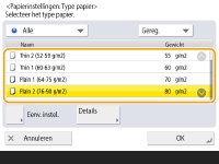 Als het papiertype van het papier dat u hebt geplaatst, niet wordt weergegeven in het gedetailleerde instelscherm, kunt u het registreren in de lijst met papiertypen.