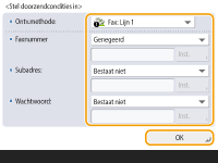 Als u <Doorzenden zonder voorw.> selecteert, kunt u alle ontvangen documenten die niet voldoen aan de opgegeven condities, doorzenden naar de gewenste bestemming. U kunt doorzenden naar meerdere bestemmingen door een groepsbestemming op te geven in <Doorzendbestemming>. Met <Geef doorz.tijdstip op> kunt u de tijd en dag voor het doorzenden opgeven. Als u <Melding doorz.gereed> instelt, kunt u een e-mail verzenden met de melding dat het doorzenden is voltooid. U kunt <Ber. alleen bij foutmel.> selecteren, zodat u geen melding ontvangt bij een succesvolle doorzending. Als u <Opslaan/Afdrukken ontv. best.> instelt op <Aan>, kunt u het ontvangen bestand opslaan of afdrukken door de geheugenslotinstellingen te volgen. Het ontvangen bestand wordt opgeslagen als Geheugenslot op <Aan> staat en het wordt afgedrukt als Geheugenslot op <Uit> staat. |