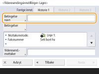 Hvis du velger <Vid.send uten betingelser> kan du videresende alle mottatte dokumenter som ikke oppfyller de spesifiserte betingelsene til ønsket destinasjon. Du kan videresende til flere destinasjoner ved å spesifisere en gruppedestinasjon i <Videresend.mottaker>. <Angi v.sendtid> lar deg spesifisere tid og dag for å utføre videresending. Hvis du angir <Videresend. utført-varsel>, kan du sende en e-post med beskjed om at videresending av dokumenter er fullført. Du kan velge <Varsel kun for feil>, slik at du ikke blir varslet om en vellykket videresending. Hvis du angir <Lagre/skrive ut mottatt fil> til <På>, kan du lagre eller skrive ut den mottatte filen ved å følge minnelåsinnstillingene. Den mottatte filen lagres hvis minnelåsen er <På> og skrives ut hvis minnelåsen er <Av>. |
