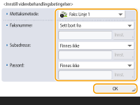 Du kan ikke endre <Mottaksmetode> etter å ha lagret <Videresendingsinnstillinger>. For å bruke videresendingsinnstillinger med <Mottaksmetode> endret, må du lagre videresendingsinnstillingene på nytt. |