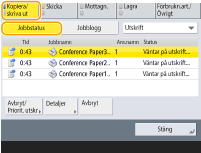 Välj ett dokument och tryck på <Detaljer> om du vill avbryta utskrift, kontrollera jobbets status etc.