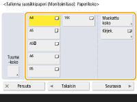 Jos <Määritä aina> -asetuksena <Monitoimitason vakioasetukset> -kohdassa on <Suosikkipaperi>, esiin tulee näyttö, josta voit valita "suosikkipaperisi", kun lisäät paperia monitoimitasolle. <Monitoimitason vakioasetukset> |