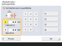 Valitse kummankin sivun pituus numeropainikkeilla valitsemalla <X> tai <Y>. ![]() Kun tallennat usein käyttämäsi paperikoot painikkeille <S1>–<S4>, voit käyttää niitä yhdellä painalluksella. Vapaan paperikoon (Muokattu paperikoko) tallentaminen | |