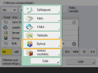![]() | Useita osoitekirjaan tallennettuja vastaanottajia (Vastaanottajien tallentaminen osoitekirjaan) voidaan yhdistää ryhmäksi. Voit käyttää tätä ominaisuutta lähettääksesi asiakirjoja ja varmuuskopioidaksesi tietoa samalla kerralla, sillä erityyppiset vastaanottajat voidaan tallentaa samaan ryhmään. Voit esimerkiksi tallentaa sähköpostiosoitteita ja tiedostopalvelimen IP-osoitteita yhdeksi ryhmäksi. |