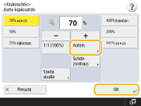 | | Voit suurentaa tai pienentää automaattisesti valittuun paperikokoon sopivaksi. Kopioiden suurentaminen tai pienentäminen paperikokoon sopivaksi