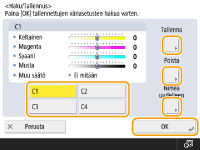 Voit tallentaa enintään neljä asetusta säädön jälkeen. Kun olet säätänyt värin, valitse <Hae/Tallenna> valitse painike <C1>–<C4> valitse <Tallenna> <Kyllä> <OK>.![]() ![]() Hae tallennetut asetukset valitsemalla <Hae/Tallenna>, valitse painike ja valitse sitten <OK>. Voit muuttaa <C1>–<C4>-painikkeiden nimiä. Valitse muutettava painike, valitse <Nimeä uudelleen> ja kirjoita uusi nimi. Voit poistaa tallennetut asetukset valitsemalla painikkeen ja valitsemalla <Poista> <Kyllä>. |