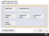 Kohdan <Lisäasetukset>  <Väritasapaino> asetukset muuttuvat automaattisesti määrittämäsi kuvan laadun mukaan. Jos valitset <Vanha valokuva>, <Yksi väri (Vanha valok.)> näkyy kopioinnin perustoimintonäytön <Valitse väri> -kohdassa. |