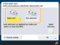 Voit tarkistaa tulostettujen sivujen lukumäärän seuraavalla tavalla: (Tilavalvonta) <Kopio/Tuloste> <Työloki> valitse dokumentti <Tiedot> tarkista kohdassa <Alkuper. siv. määrä> näkyvä numero.Tilanäytössä ja raportissa näytetään lukumäärä, mukaan lukien tyhjät sivut. Kopioiden/Tulosteiden tilan tarkistaminen Kopiolaskuriin ei lisätä tyhjiä sivuja, jotka tallennetaan. Skannauslaskuriin nämä sivut kuitenkin lisätään. |