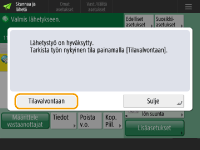 Määritettyjen vastaanottajien määrän tarkistaminenMääritettyjen vastaanottajien määrä näkyy näytön oikeassa yläkulmassa. Näin voit varmistaa ennen lähettämistä, että vastaanottajien määrä on oikea. Lähetys lähettäjän tiedoillaLähetettyjen asiakirjojen tilan tarkistaminenKun <Näytä ilmoitus kun työ on hyväksytty> -asetuksena on <Kyllä>, <Tilavalvonta>-näyttö voidaan avata seuraavalla näytöllä, joka tulee esiin, kun lähetystyö vastaanotetaan. <Näytä ilmoitus kun työ on hyväksytty>Raportin tulostaminen lähetysten tuloksistaKun haluat asettaa tämän kullekin työlle kohdassa <Lisäasetukset>, sinun on valittava <Vain virhetilassa> tai <Ei> kohdassa <Lähetystulos -raportti> ja määritettävä <Salli tulostus lisäasetuksista> -asetukseksi <Kyllä>. Tiedostojen turvallinen lähettäminenKun lähetyssä kuvassa olevat valokuvat ovat liian tummia tai vaaleita, värillisten alkuperäisten taustavärejä ei voi poistaaLähetetyn kuvan laatua voidaan ehkä parantaa, jos seuraavat ehdot/asetukset täytetään. Työn tyyppi: Faksi (muistilähetys) tai Skannaa ja lähetä (faksi/I-faksi) <Valitse väri>: <Mustavalkoinen> (Skannaa ja lähetä) <Alkuperäisen tyyppi>: <Teksti> <Tummuus> <Taustan tummuus>: <Autom.> <Tarkkuus>: 200 dpi x 400 dpi, 300 dpi x 300 dpi*, 400 dpi x 400 dpi, tai 600 dpi x 600 dpi* *Voidaan määrittää toiminnolle Skannaa ja lähetä |