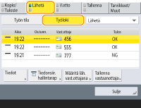 Valitsemalla <Tiedot> <Lähetä uudelleen> voit lähettää tai tallentaa uudelleen asiakirjat, joiden lähetys tai tallennus epäonnistui. Voit määrittää toisen vastaanottajan valitsemalla <Muuta vastaanottaja>. Voit lähettää asiakirjoja useille vastaanottajille samalla lähetys- tai tallennustavalla valitsemalla <Lähetyslista>, valitsemalla vastaanottajan ja valitsemalla sitten <Lähetä uudelleen> tai <Muuta vastaanottaja>.Voit lähettää tai tallentaa asiakirjat uudelleen, kun <Poista virheellinen lähetys> -asetuksena on <Ei>. <Poista virheellinen lähetys> Voit vaihtaa sellaisten asiakirjojen vastaanottajia jotka on asetettu lähetettäväksi/tallennettavaksi määrättynä aikana tai joiden lähetys/tallennus epäonnistui. Huomioi, että et voi vaihtaa sellaisten lähetettävien tai tallennettavien asiakirjojen vastaanottajia, joille on määritetty useita vastaanottajia, tai jos uuden vastaanottajan syöttäminen on estetty (Uusien vastaanottajien estäminen). |