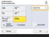 1 | Valitse <OOXML> valitse <PowerPoint> alasvetoluettelosta.![]() ![]() Jos haluat vaihtaa OCR:n käyttämän kielen, paina kohtaa <Aseta tiedot> <Muuta> valitse kieli paina <OK>-painiketta. |