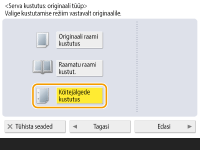 1 | Vajutage <Raamatu raami kustut.> ja kinnitage <Originaali form.>. ![]() Kui väljal <Originaali form.> kuvatud formaat erineb teie asetatud raamatust, vajutage <Muuda>, et valida formaat. |