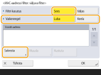 Tehke kuval <Vaikereegel> valik <Keela>, et lubada side ainult nende seadmetega, mille MAC-aadress on sisestatud järgmises etapis kirjeldatud kuval <Erandi aadress> või valige <Luba>, et keelata side loomine nende seadmetega.