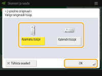 Valige seade <Raamatu tüüpi> originaalide jaoks, kus kujutised on esi- ja tagaküljel samas suunas või seade <Kalendri tüüpi> originaalide jaoks, kus kujutised on esi- ja tagaküljel vastassuunas.
