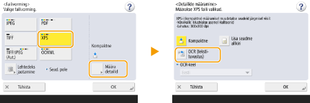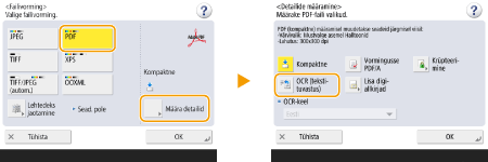 ![]() | See režiim võimaldab tuvastada skannitud dokumendi tekstiosa, teisendada tähemärgid tekstikujule ning luua tekstiotsimisvõimalusega PDF/XPS/OOXML (pptx/docx) faile. Võite määrata ka valiku <Kompaktne>, kui valite failivorminguks PDF- või XPS-faili. |
