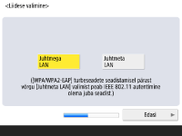Määrake masina võrguga ühendamise meetod. ![]() ![]() Saate valida meetodi masina ühendamiseks arvutitega jne. Valige kasutatav ühendusviis ja vajutage <Edasi>. Kui valisite <Juhtmega LAN>, jätkake juhisega 7. Lisateavet võrguühendusmeetodite kohta vt Võrguühendusmeetodi valimine. ![]() Kui valisite <Juhtmeta LAN>, määrake juhtmeta kohtvõrgu seaded. ![]() Juhtmeta kohtvõrgu ühenduste kohta leiate üksikasju Ühenduse loomine traadita side kohtvõrguga. | |