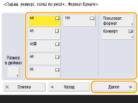Нажмите кнопку <X> или <Y>, чтобы ввести значение длины каждой стороны с помощью цифровых клавиш. ![]() Если кнопкам <S1>–<S4> назначены часто используемые форматы бумаги, то требуемый формат бумаги можно задать одним нажатием соответствующей кнопки. Регистрация бумаги произвольного формата (Бумаги пользовательского формата) | |