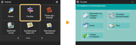 Пользуйтесь инструкциями по работе с функциямиНажмите кнопку <Пособие>, чтобы отобразить инструкции по работе с функциями аппарата, а также советы по использованию функций копирования, сканирования и т. д. Воспользуйтесь этим экраном, чтобы подробнее узнать о доступных функциях и порядке их использования. Пример. Учебник по работе с функциями копирования При выборе пункта из списка отображается экран учебника. Используйте функции справкиВ зависимости от выбранной функции в некоторых случаях в верхней правой части экрана отображается кнопка  . Нажмите кнопку  , чтобы ознакомиться с описанием функции и инструкциями по работе с ней. Нажмите кнопку <Конец>, чтобы вернуться на предыдущий экран. Управляйте сенсорным дисплеем так же, как и смартфоном (с помощью жестов перелистывания и переноса)На некоторых экранах можно переключаться между страницами с помощью жеста перелистывания (вверх, вниз, влево и вправо), как на смартфоне. Жесты перелистывания и операции переноса нельзя использовать, если для параметра <Обратить цвета экрана> задано значение <Вкл.>. <Обратить цвета экрана>На экранах с перемещаемыми кнопками вы можете перетаскивать кнопки. |