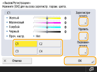 После настройки можно зарегистрировать до четырех параметров. После настройки цвета нажмите <Вызов/Регистр.> выберите кнопку от <C1> до <C4> и последовательно нажмите <Зарегистрировать> <Да> <OK>.![]() ![]() Чтобы вызвать зарегистрированные параметры, нажмите <Вызов/Регистр.>, выберите кнопку и нажмите <OK>. Кнопки от <C1> до <C4> можно переименовать. Выберите кнопку для изменения, нажмите <Переименовать> и введите новое имя. Чтобы удалить зарегистрированный параметр, выберите кнопку и последовательно нажмите <Удалить> <Да>. |