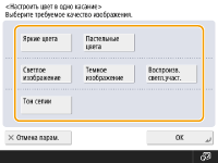 Можно выбрать несколько типов качества изображения одновременно. Однако нельзя одновременно выбрать <Яркие цвета> и <Пастельные цвета>, а также <Светлое изображение>, <Темное изображение> и <Воспроизв. светл.участ.>.