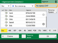С помощью кнопок <Регистр.нов. адресатов>, <Детали/Правка> и <Удалить> в разделе <Регистр./Правка> на экране <Адресная книга (локальная)> можно зарегистрировать новых адресатов, проверить данные, а также изменить или удалить адресатов. Для использования дистанционной адресной книги необходимо настроить параметры аппарата-сервера. Задайте в аппарате-сервере возможность внешнего доступа к дистанционной адресной книге. |
